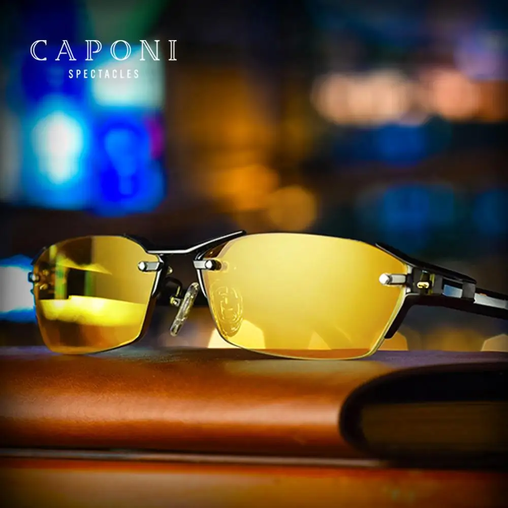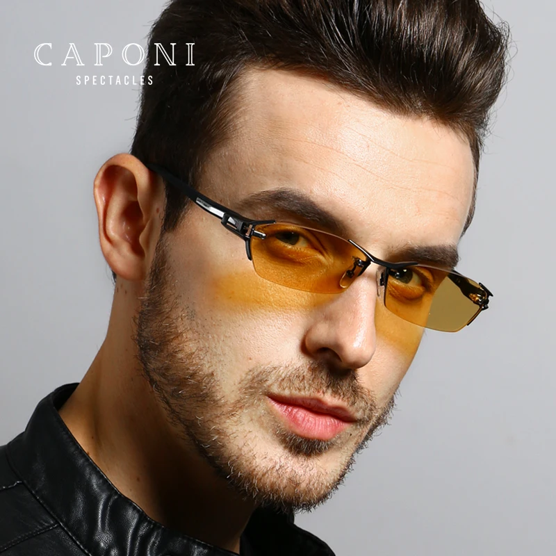 CAPONI Yellow Sunglasses For Men Pure Titanium Frame Polarized Day Night Car Driving Discoloration Lenses Sun Glasses BSYS1190